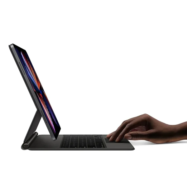 - مع تصميم ناتئ عائم، يتم توصيل جهاز ايباد برو مغناطيسيًا ويسمح لك بالتكيف بسلاسة مع زاوية الرؤية المثالية.
